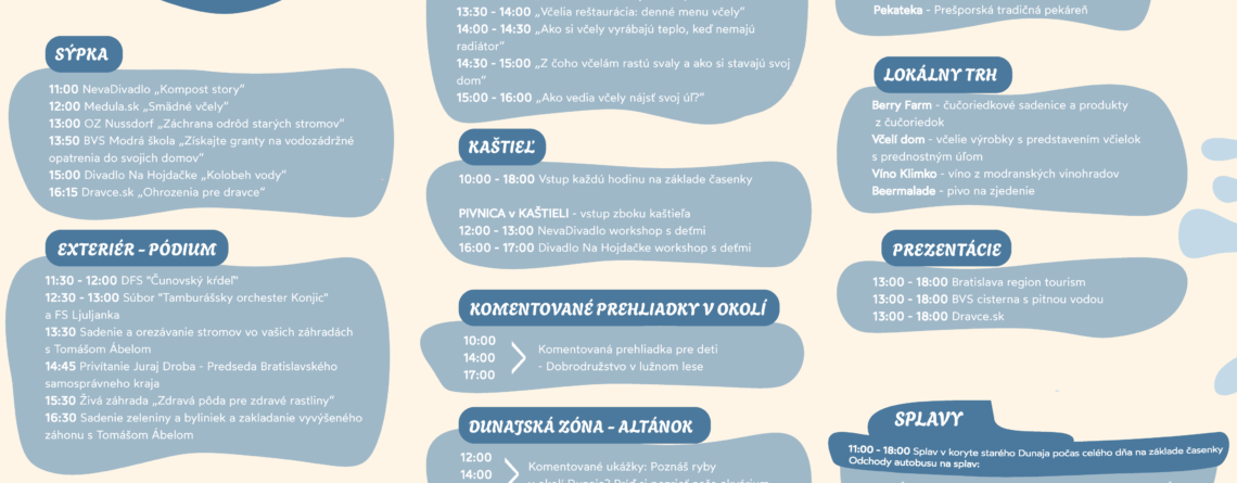 Príďte sa zabaviť s celou rodinou, čaká vás veľa krásných prednášok, divadielok, worshopov ako aj možnosť ísť vyskúšať splavovanie starého koryta Dunaja.